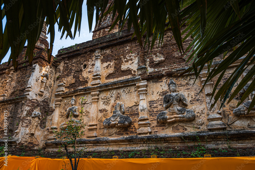 Old Ancient stucco patterns stucco Buddha and angel figures on the outside of the Maha Chedi Wat Chet Yot, seven pagoda temple It is a major tourist attraction in Chiang Mai, Thailand.