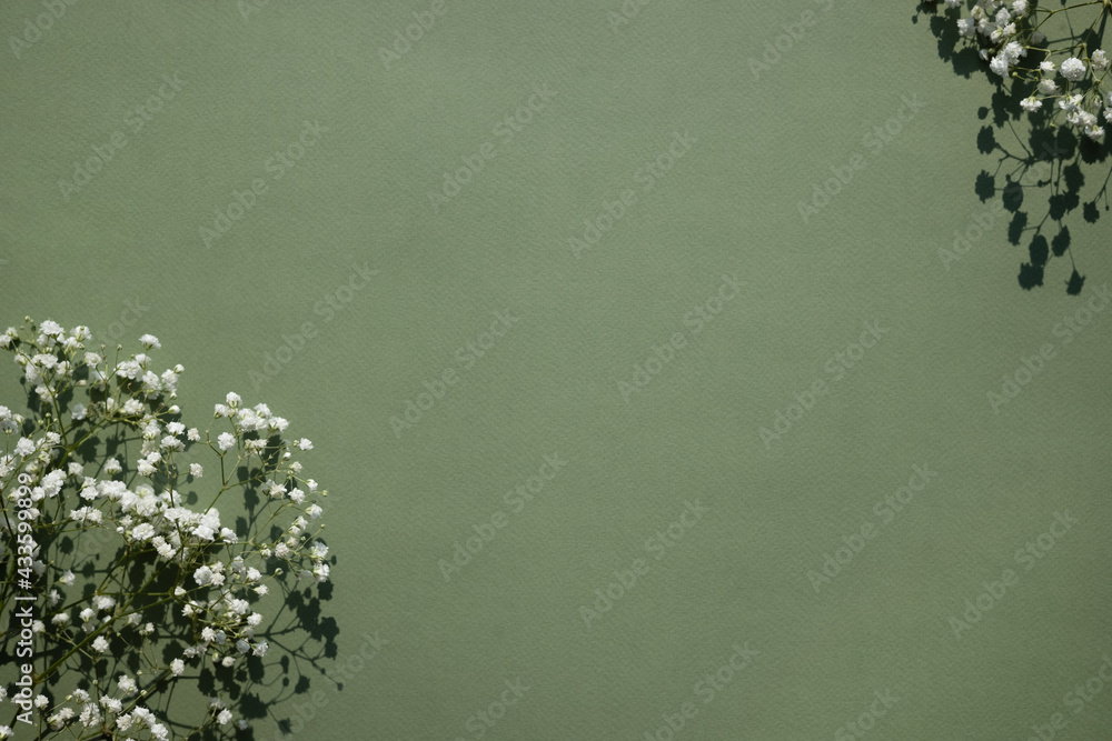 Small white flowers on pastel green background with hard light shadows. Happy Women's Day, Wedding, Mother's Day, Easter, Valentine's Day, Eco and Green Planet concept. Flat lay