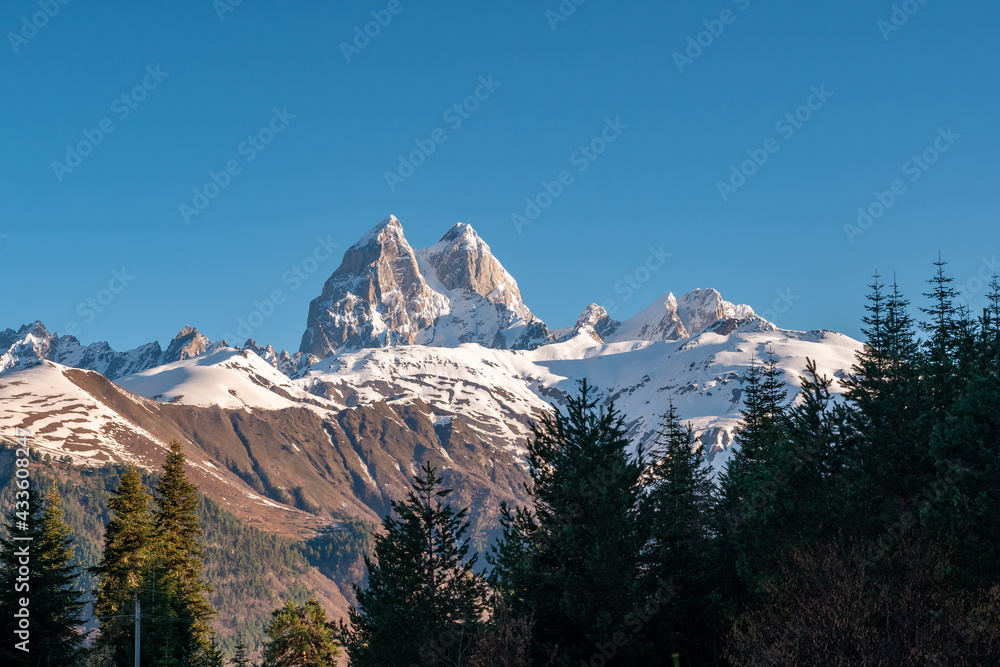 View of Mount Ushba. Ushba is one of the most notable peaks of the Caucasus range, located in the Svaneti region of Georgia