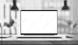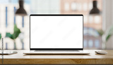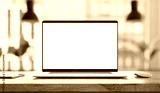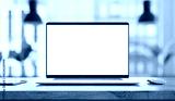 Laptop with frameless blank screen mockup template on the table in industrial office loft interior