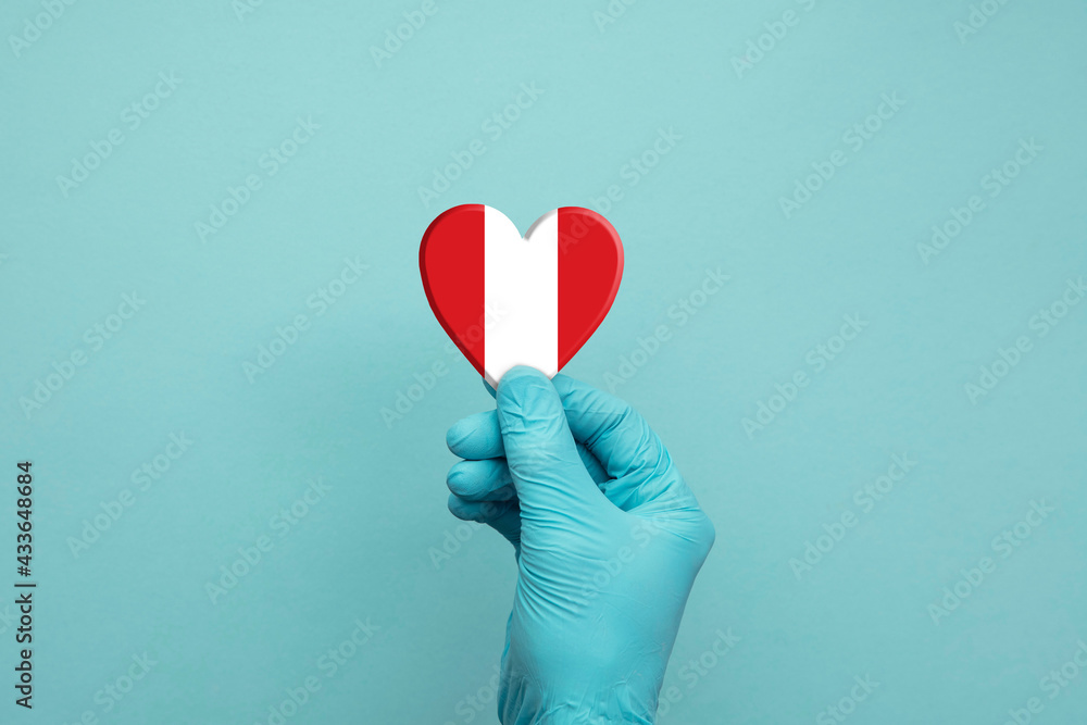 Hands wearing protective surgical gloves holding Peru flag heart