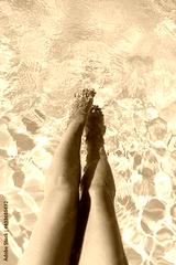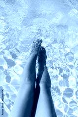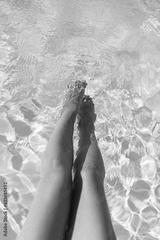 Beautiful tanned woman legs relaxing in pool water, enjoying summer vacation, view above. Slim young female relaxing at tropical resort, feet sunbathing and relaxing in swimming pool