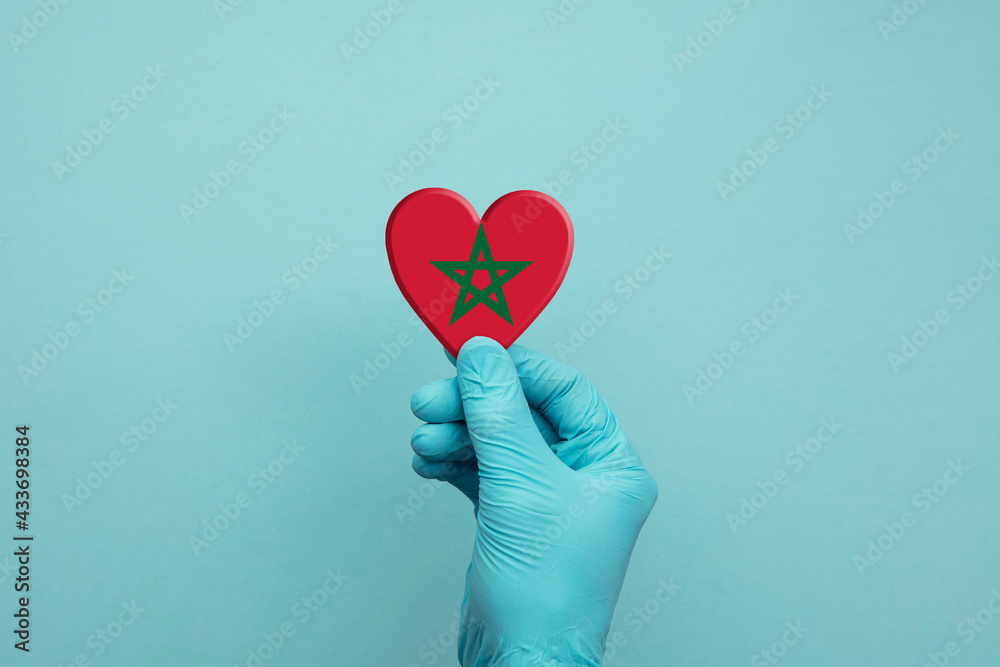 Hands wearing protective surgical gloves holding Morocco flag heart