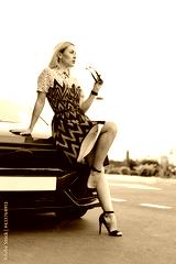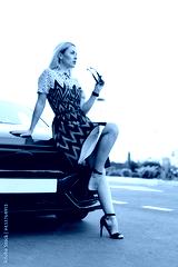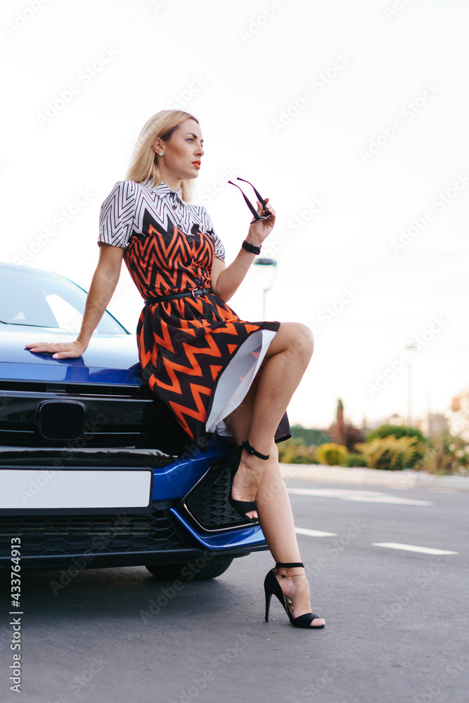 Stunning young woman waring dress posing in front of her car outdoors, ownership driver