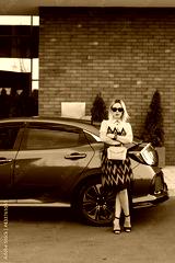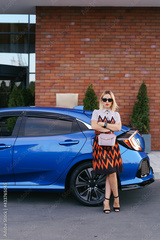 Stunning young woman waring dress posing in front of her car outdoors, ownership driver