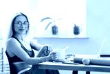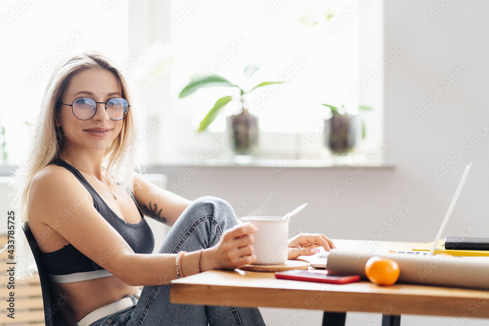 CAucasian freelancer woman work from home. Female hold tea chatting or watching movie use laptop. Modern girl relaxing at kitchen surfing internet