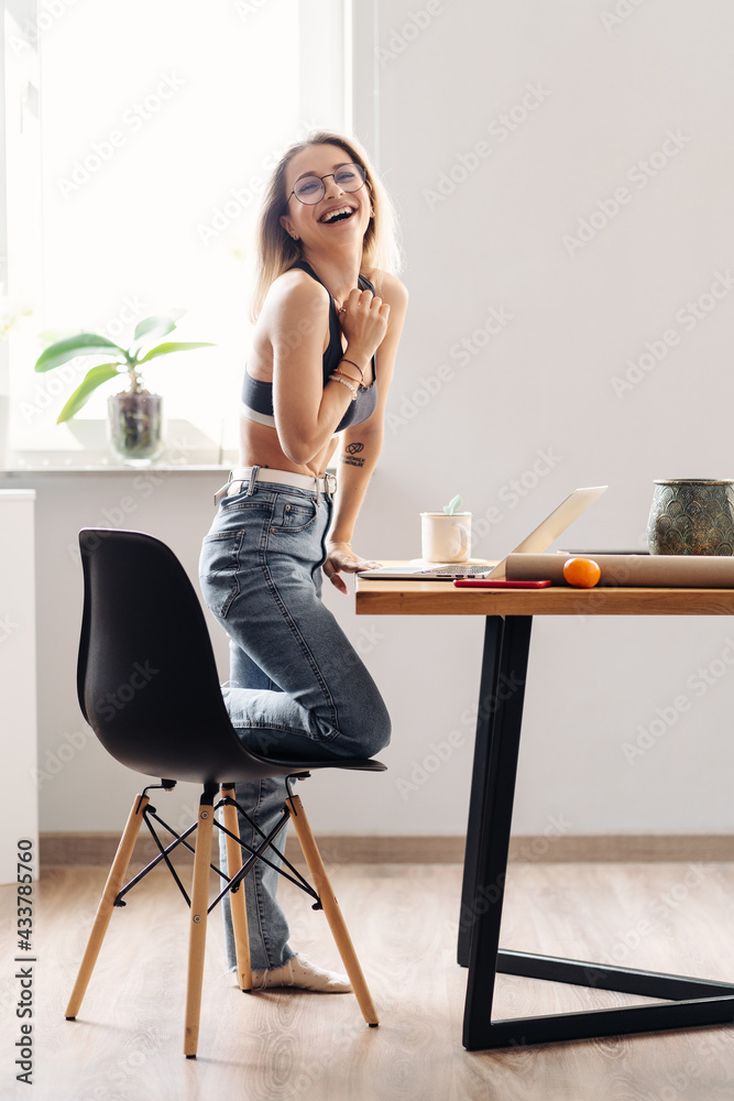 CAucasian freelancer woman work from home. Female hold tea chatting or watching movie use laptop. Modern girl relaxing at kitchen surfing internet