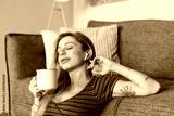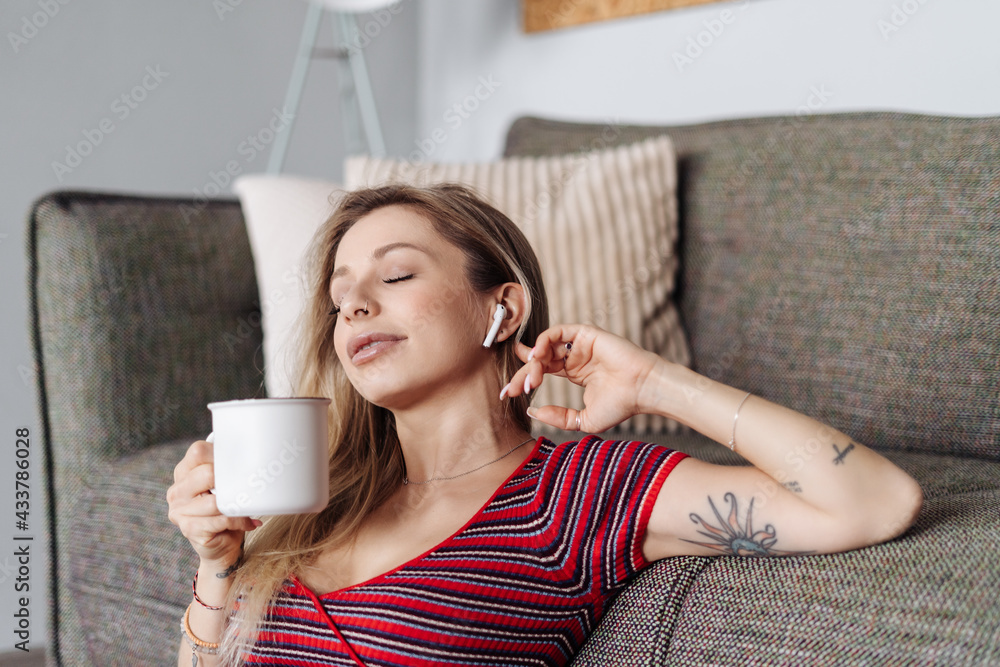 Woman listening music in headphones while sitting near sofa in living room drinking tea