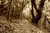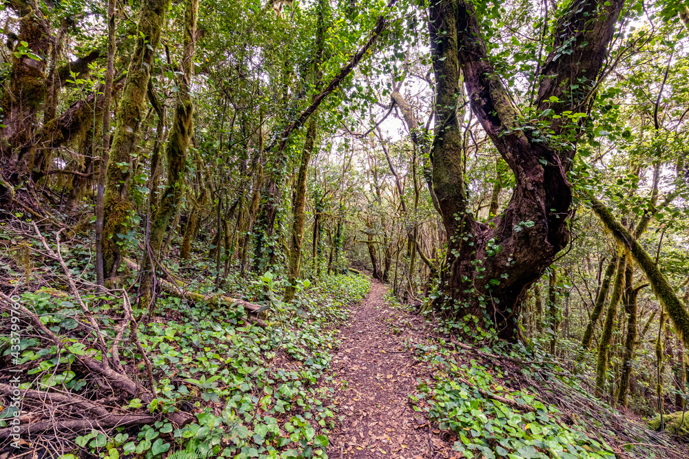 Canary Islands. Evergreen forest in Garajonay National Park, tourist footpath, La Gomera Island, Spain.