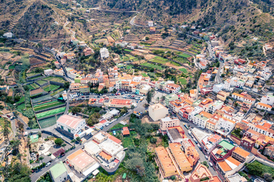 La Gomera - Roque El Cano and town Vallehermoso from above. La Gomera, Canary Islands.