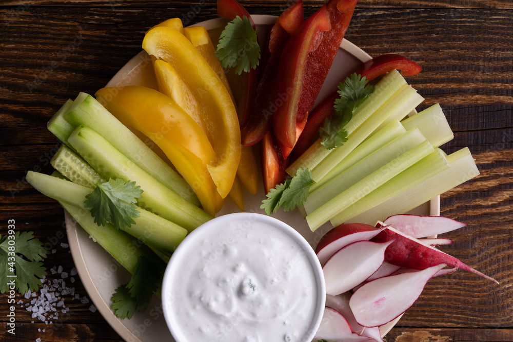 Keto diet snack platter with vegetable crudites and blue cheese dipping sauce
