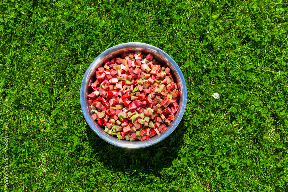 Rhabarberstücke in einer Schüssel zur Weiterverarbeitung