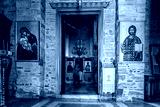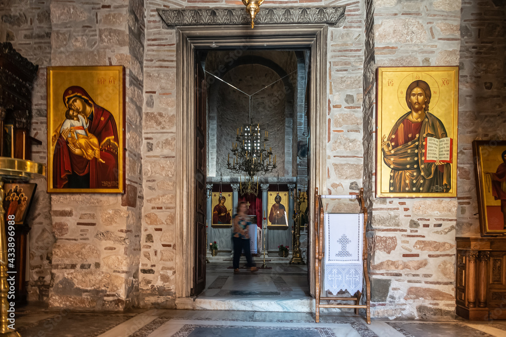 Distomo ,Greece - 10.08.2019 :Interior View and golden mosaic on walls and ceiling of the byzantine monastery of Hosios Loukas (Holy Lucas) in Greece.