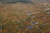 Aerial view of swamp and wooden path in Kemeri national park during sunrise, Latvia.