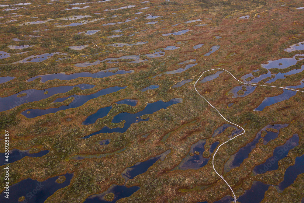 Aerial view of swamp and wooden path in Kemeri national park during sunrise, Latvia.