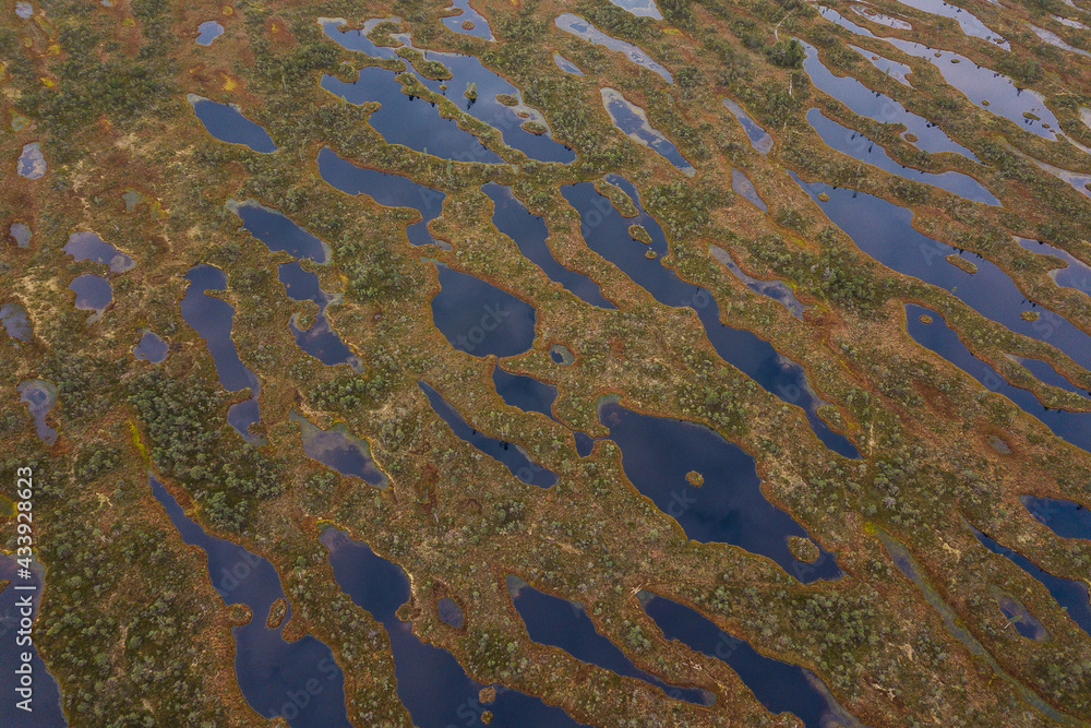Aerial view of swamp and wooden path in Kemeri national park during sunrise, Latvia.
