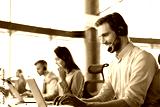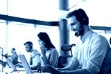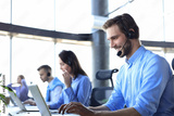 Smiling male call-center operator with headphones sitting at modern office with collegues on the backgroung, consulting online.