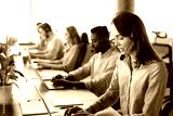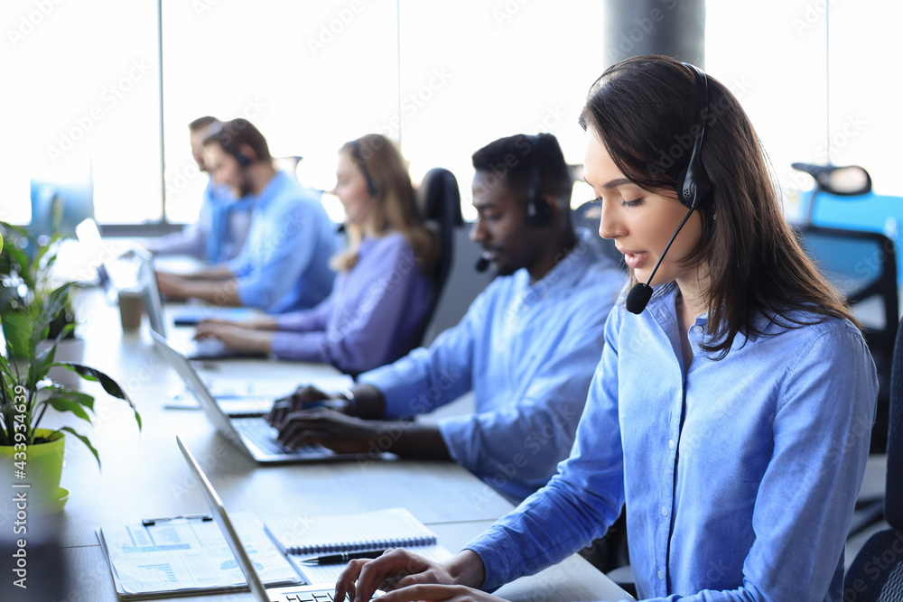 Female customer support operator with headset and smiling, with collegues at background.
