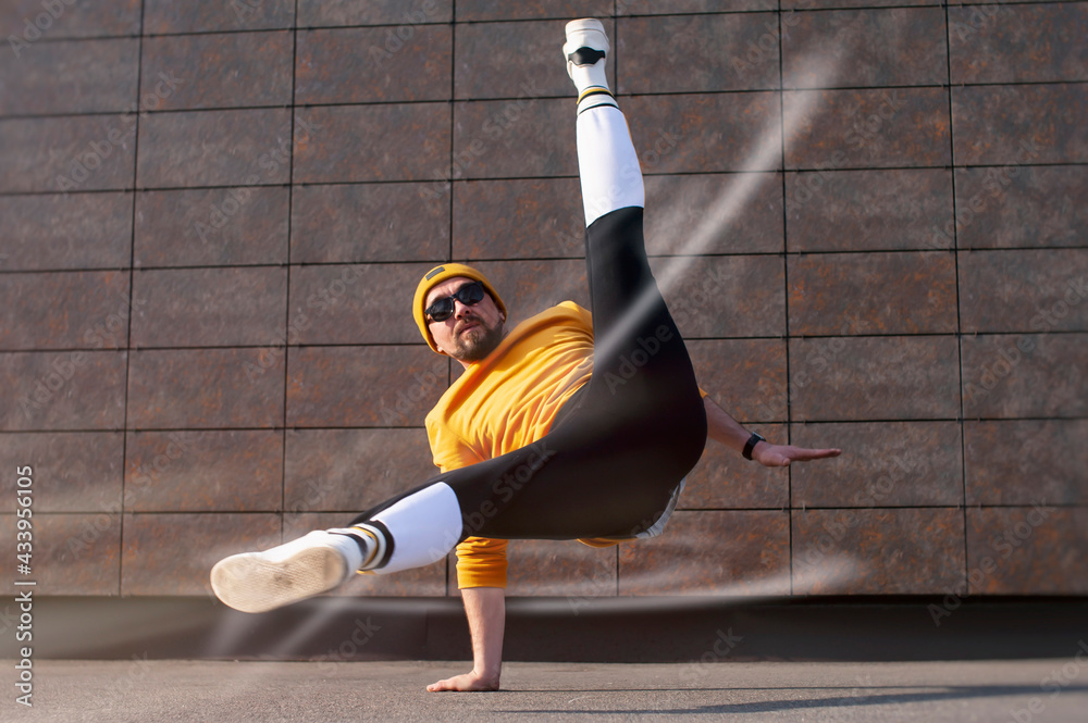 Man street Break Dancer is Dancing in the street. BBOY makes an acrobatic element Flare.