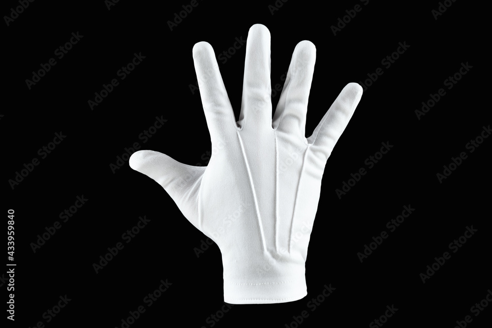 Human hand, hand in white glove isolated on black background, shows five fingers gesture. Human gesture concept.