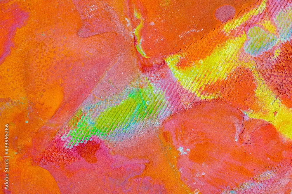 Oxidized etched copper, abstraction. Natural orange, blue. green yellow background with patina rusty copper plate