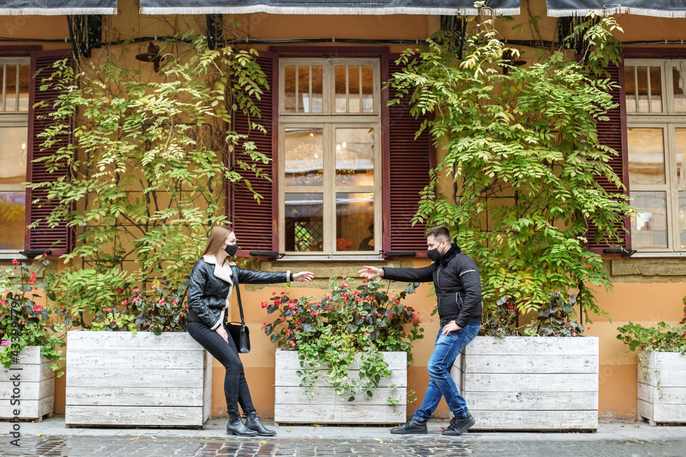 Two people, a guy and a girl in black clothes and a medical mask, reach out to each other