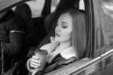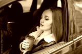 One girl with long hair and a guy sitting in a black car, view from the window. Holding a glass of coffee, thinking.