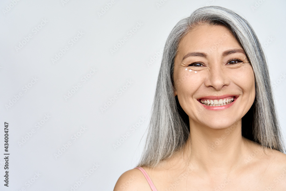 Mature beautiful middle aged asian woman, senior older grey haired lady looking at camera touching face applying under eye antiaging anti wrinkle perfect skin care cream, isolated on white headshot.