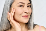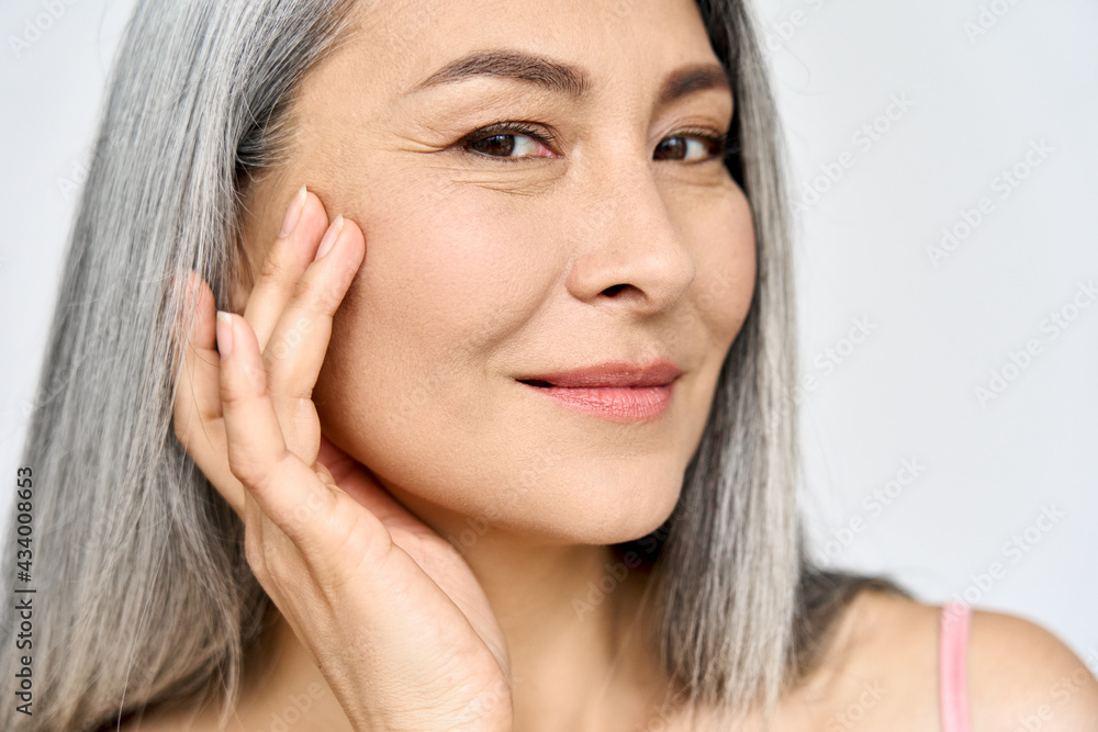 Closeup portrait of middle aged Asian woman's face with perfect skin. Older mature lady touching pampering face. Advertising of cosmetology salon plastic surgery procedures skincare.