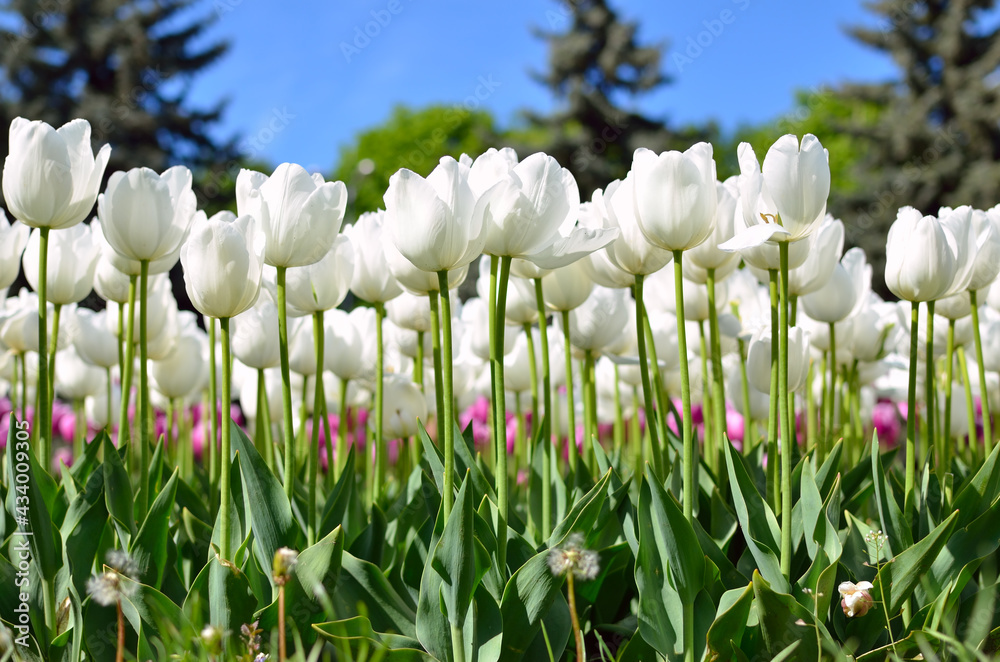 Young tulips bloomed in the park in spring