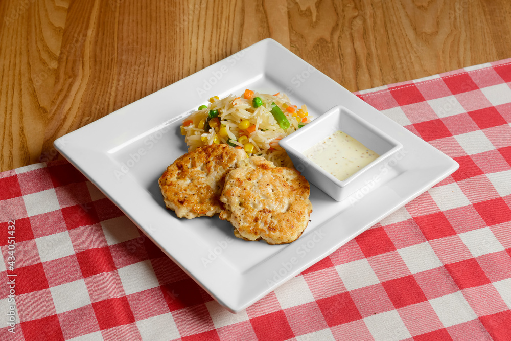 Rice with vegetables and fried meat cutlet served in a white square plate over red plaid table cloth