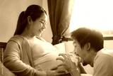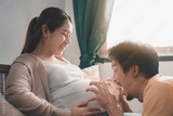Asian pregnant woman and husband are smiling and play with they baby in belly, Happy family, Expectation of a child and Maternity prenatal care and woman pregnancy concept.