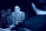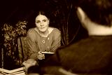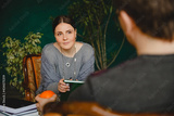 A brunette european woman psychologist conducts a patient's appointment in office. She sits across and listens him