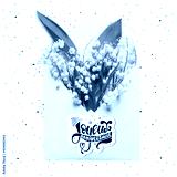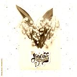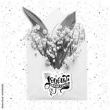 Joyeux anniversaire Happy Birthday in French greeting card. Creative layout made with Bouquet of lilies of the valley in an envelope flowers.