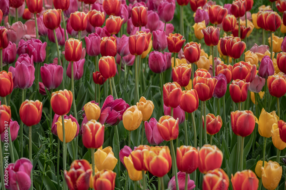 Multicolored tulips field. Horizontal photo. Bright spring flowers