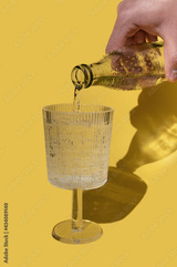 Man hand pouring water on glass on yellow background with shadows on sunlight of sunset or sunrise. Trendy minimal concept.