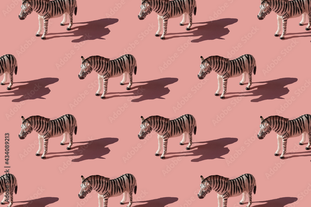 Pattern made with zebra toy on pink background. Trendy minimal picture with hard sunlight shadows.
