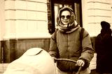 Fashionable modern mom with a stroller on a walk in the city, autumn. Mom drives a stroller through the streets, close-up