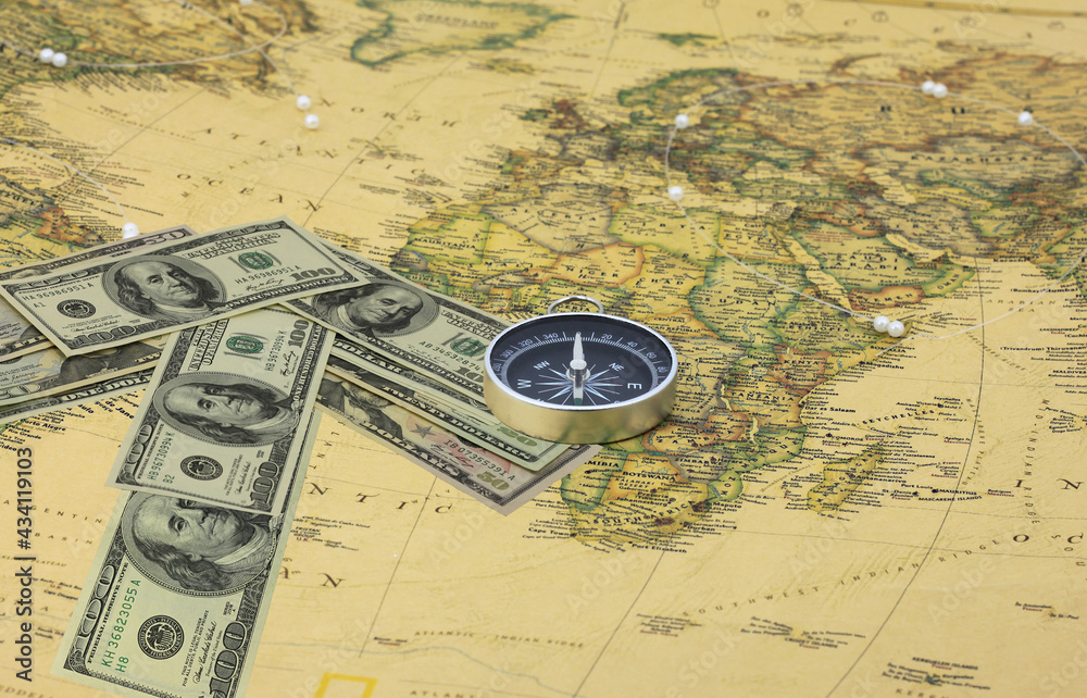 American dollars in form of arrow that indicates direction and navigation compass on old vintage world map as symbol of tourism with compass, travel with compass and outdoor activities with compass