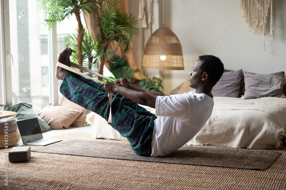African man practicing yoga indoors doing Boat Pose or Paripurna Navasana