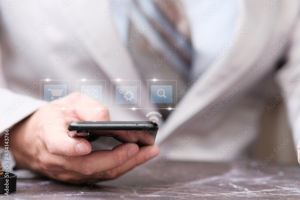 Businessman using a smartphone and working with business icon, internet and contract icon