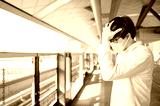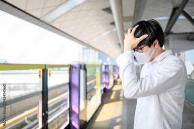 Asian man wearing face mask feeling headache at urban train platform. Coronavirus (COVID-19) pandemic prevention in public transportation. Health awareness for PM2.5 air pollution protection.
