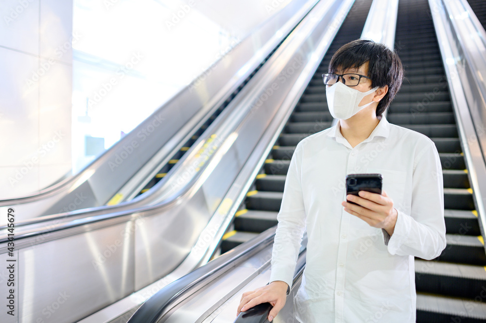 Asian man wearing face mask on escalator at urban train station. Coronavirus (COVID-19) pandemic prevention in public transportation. Health awareness for PM2.5 air pollution protection.