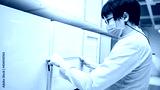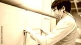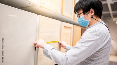 Asian man wearing face mask using tape measure on cabinet panel choosing wooden materials for built-in furniture design. Shopping furniture and house decoration. Home improvement concept