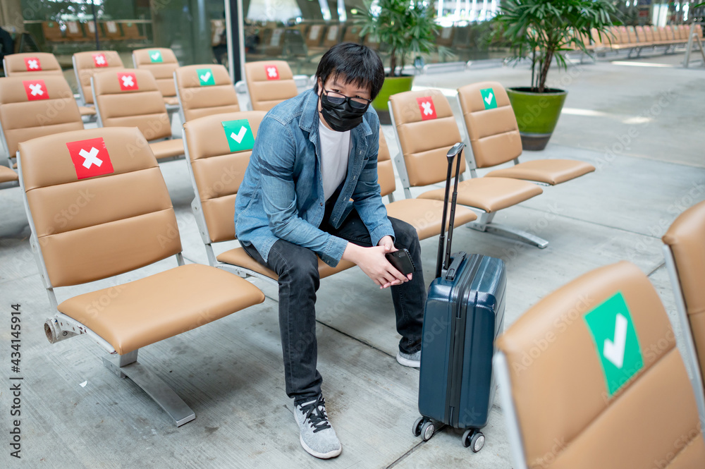 Asian man tourist wearing protective face mask sitting with suitcase luggage in airport terminal. Coronavirus (COVID-19) pandemic prevention when travel abroad. Health awareness and social distancing