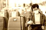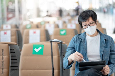 Asian man tourist with suitcase luggage wearing face mask using digital tablet in airport terminal. Coronavirus (COVID-19) prevention when travel abroad. Health awareness and social distancing concept