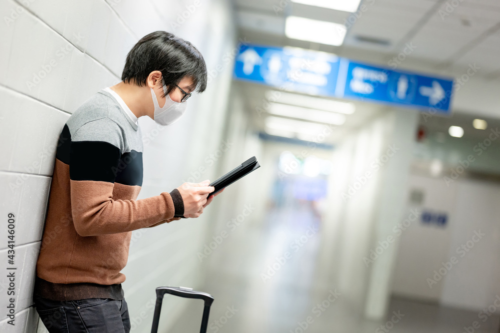 Asian man tourist wearing face mask using digital tablet while waiting for check-in in airport terminal. Coronavirus (COVID-19) pandemic prevention when travel. Health awareness and social distancing