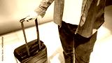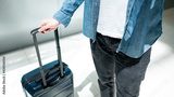 Travel insurance concept. Male tourist carrying suitcase luggage waiting for check in and baggage claim in airport terminal.