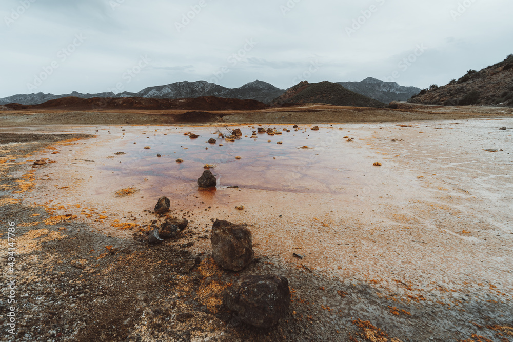 Closeup shot of sulfur ground under a cloudy sky in Murcia, Spain