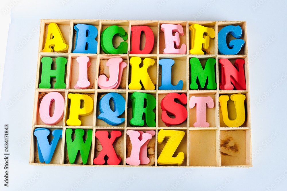Alphabet Letters in different colors for decoration of kids in wood box.